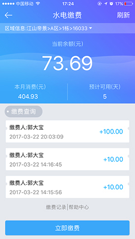 可随时查询水电气热账单余额,可查看电费缴纳明细